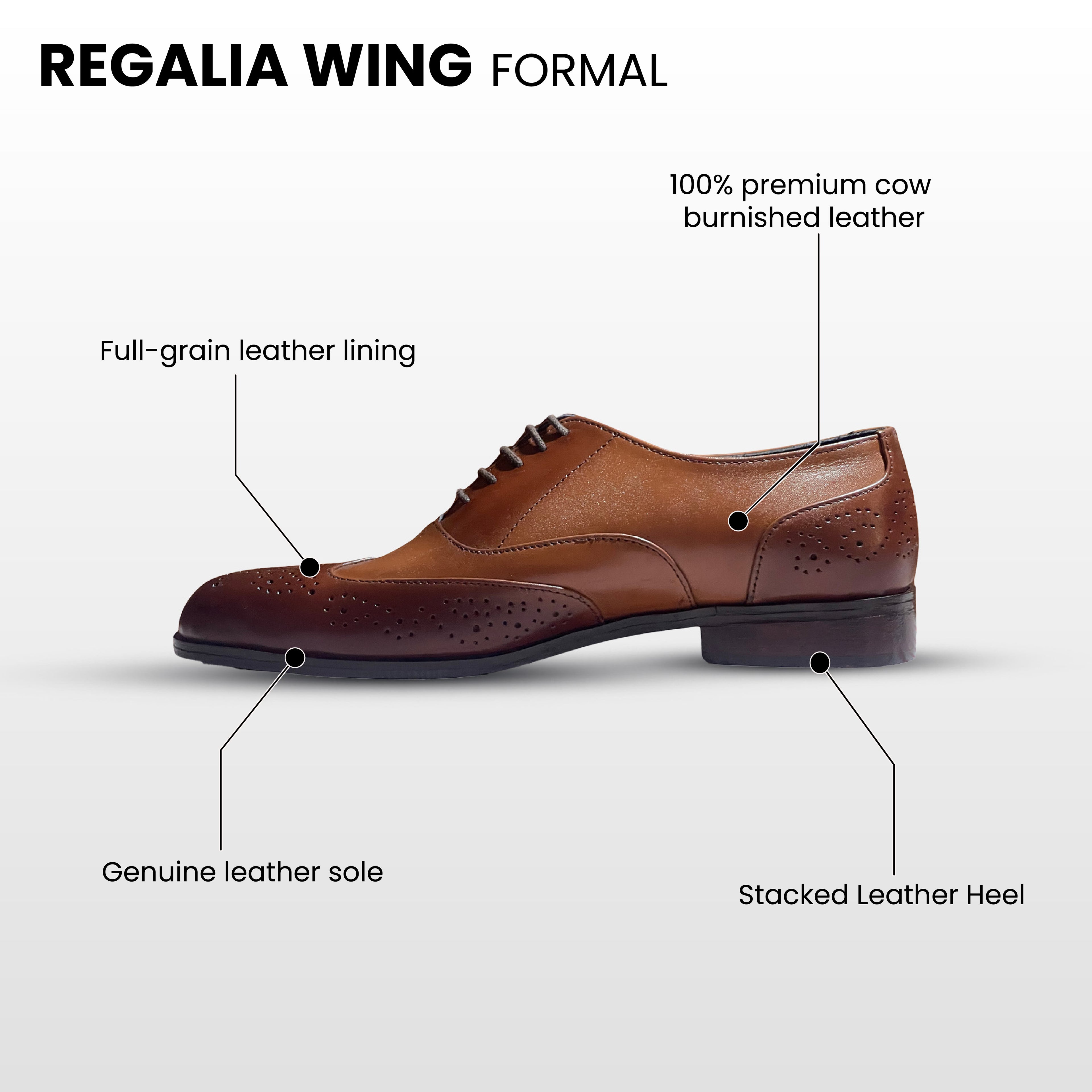 Step into timeless elegance with the Regalia Wing where craftsmanship meets sophistication. Inspired by the classic English wingtip design, this shoe celebrates the heritage of fine shoemaking with a modern burnished finish. The name “Regalia” reflects prestige and authority, while “Wing” symbolizes freedom and movement together, they define a shoe made for those who appreciate luxury and distinction. Whether for boardrooms, weddings, or evening events, the Regalia Wing commands attention and leaves a mark of refined taste.