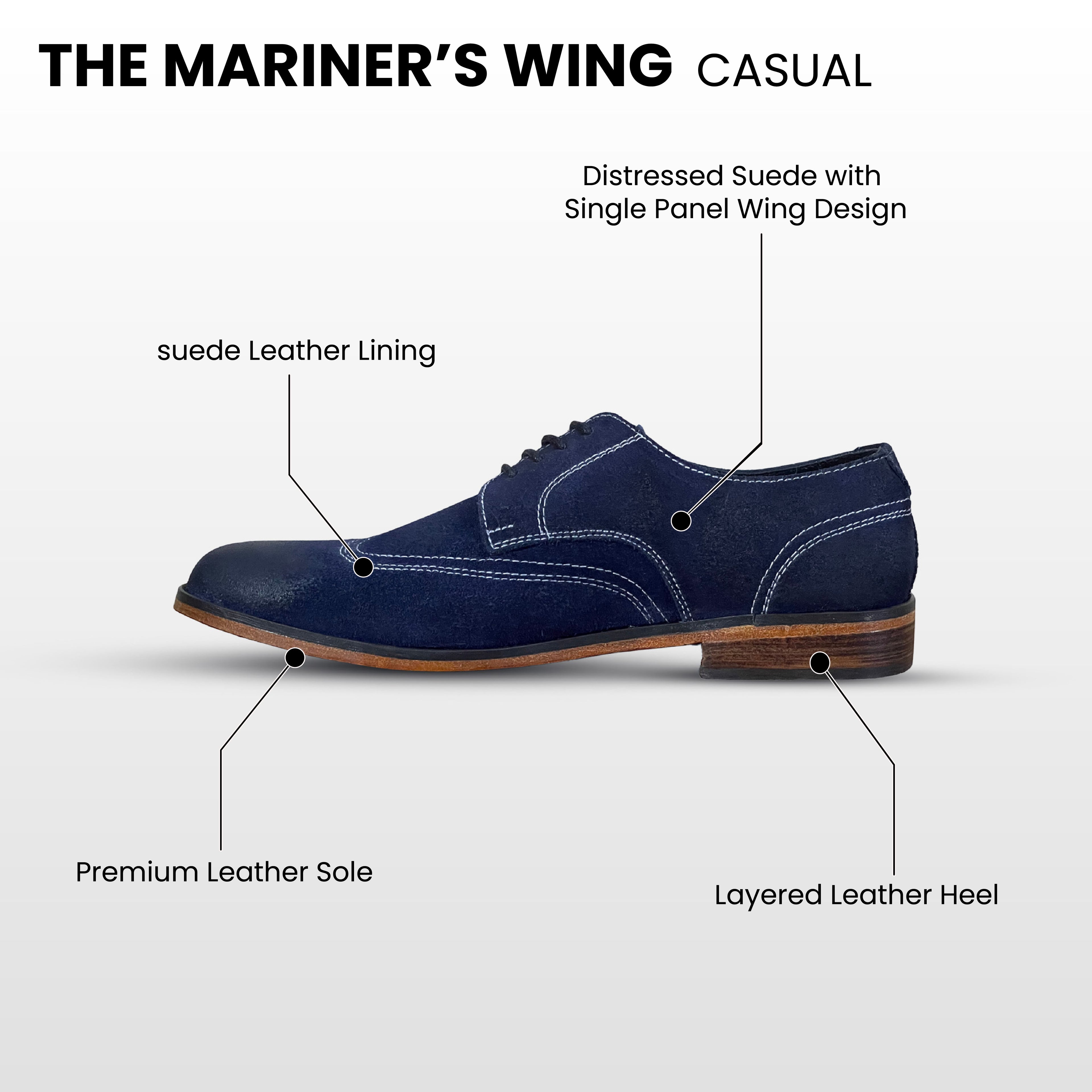 From the quiet confidence of a seasoned sailor to the calm precision of a craftsman’s hand, The Mariner’s Wing captures the essence of timeless exploration. Designed for those who move with purpose, this distressed suede Derby merges maritime inspiration with urban elegance.